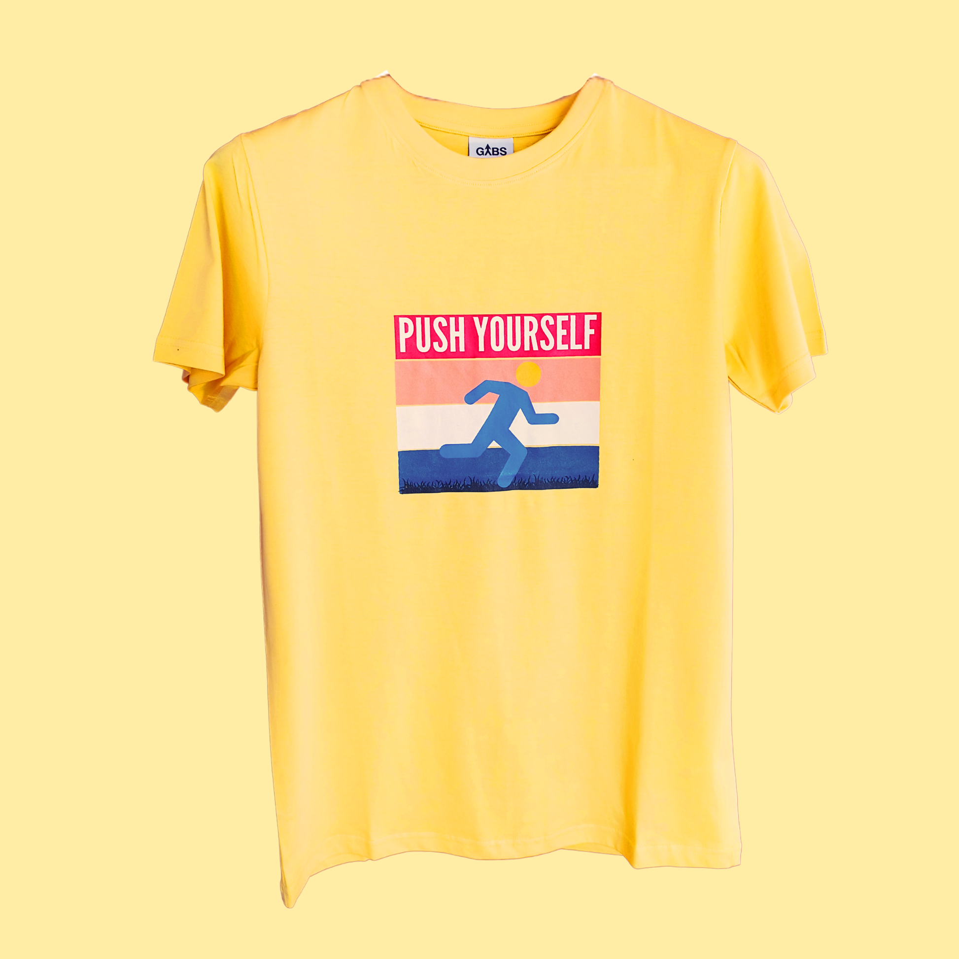 Featuring a bold, athletic figure in motion and bright, retro-inspired stripes, this tee is the perfect reminder to stay active—physically and mentally. The vibrant design on a clean backdrop adds an energetic touch, making it an ideal choice for fitness enthusiasts and those always pushing for more.